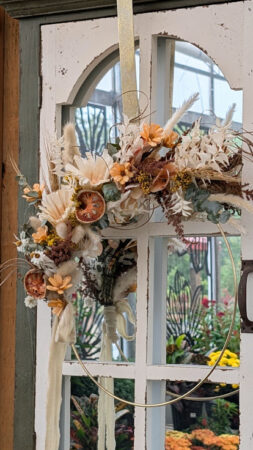 Craft a stunning dried floral wreath on a modern wire base. We’ll guide you through arranging soft neutral tones, dried citrus, and natural textures to design a piece that works beautifully for fall – and all year round! Perfect as home decor indoors or outdoors in a covered, protected location. Use it season after season.