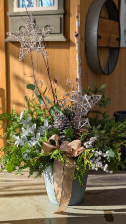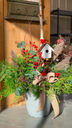 Winter Forest Pot, using fresh winter greens, large pinecones, berries, and birch or dogwood twigs. For an extra flourish, add a star or birdhouse accent to make it truly your own!